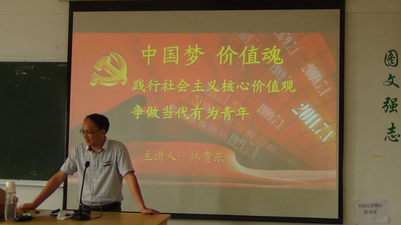 林贵东副教授围绕“中国梦记录着中华民族的非凡历史”、“中国梦承载着改革开放伟大历程”、“培育社会主义核心价值观,抵御西方价值观渗透” 、“践行社会主义核心价值观,争做当代有为青年”四个篇章展开论述。他重点介绍了争做当代有为青年的要求,勉励广大学员:一是信念坚定,爱国奉献;二是品格高尚,正己率下;三是艰苦奋斗,立志成才;四是践行宗旨,诚信友善。