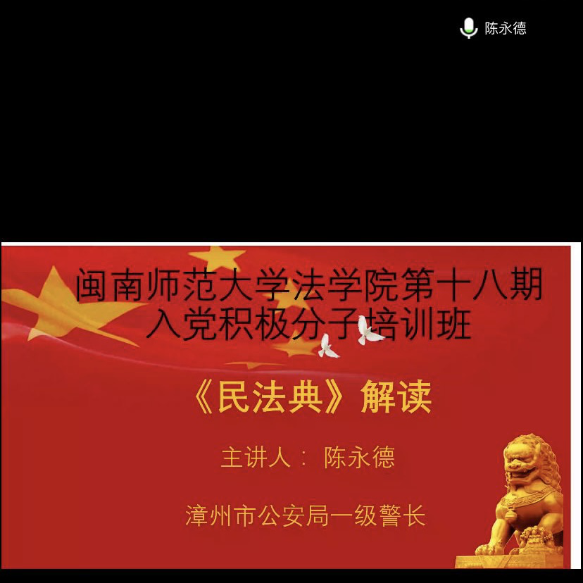 分党校第十八期入党积极分子培训班第四讲通过线上方式举行。本次党课以“《民法典》解读”为主题,由漳州市公安局一级警长陈永德老师主讲。