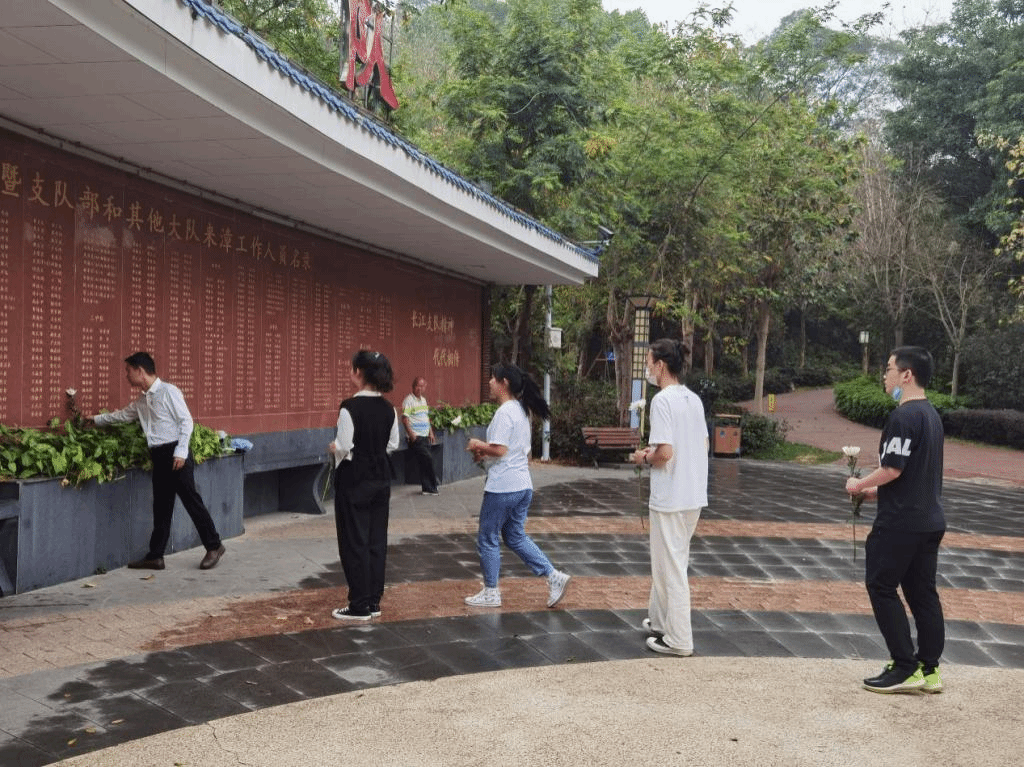 师生党员在整齐的队伍中,心怀崇敬地肃立在刻着“永远的长江支队”的纪念碑前,缅怀长江支队的党员前辈,向为了福建的解放和建设而牺牲的英雄先烈致哀。