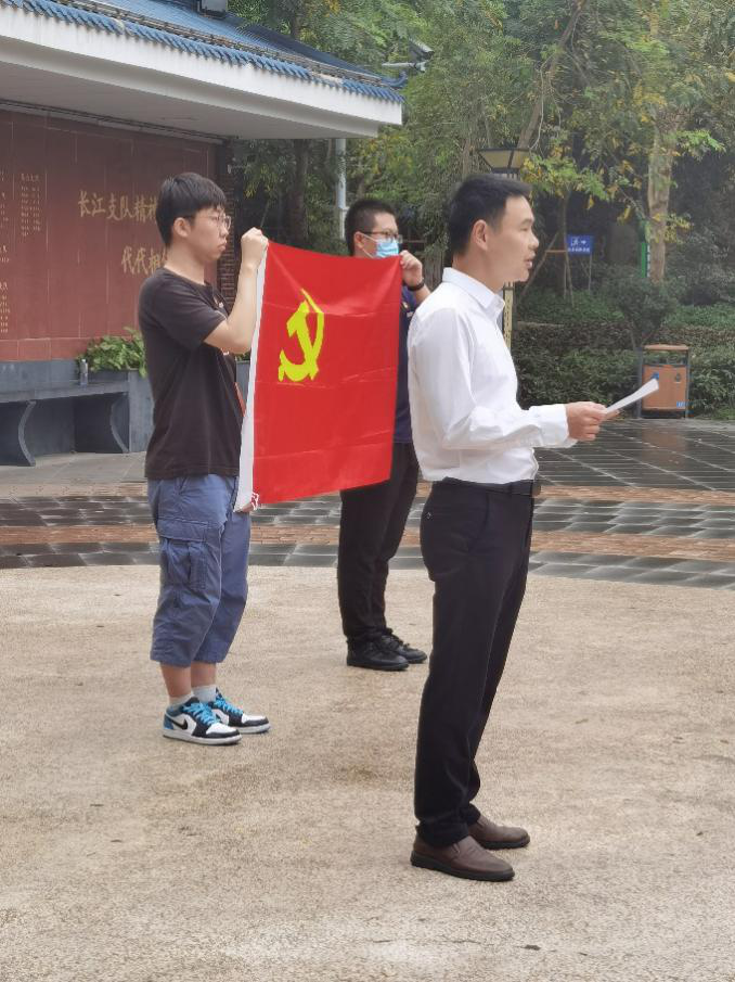 在庄严肃穆的氛围中,研究生党员崔浩带领着全体党员重温了入党誓词,党员们再一次对着党旗庄严宣誓。随后,现场师生党员在潘副书记的带领下参观“永远的长江支队”纪念长廊,向长江支队来漳工作人员敬献鲜花。