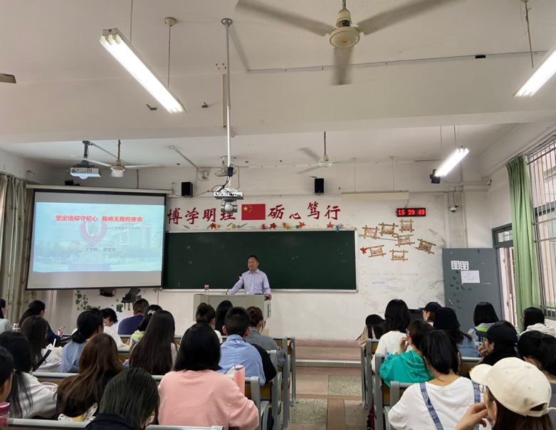 分党校入党积极分子培训班第二讲在博西105举行。本次党课以“坚定信仰守初心,我将无我担使命”为主题,由文学院党委副书记谢斌斌老师主讲。