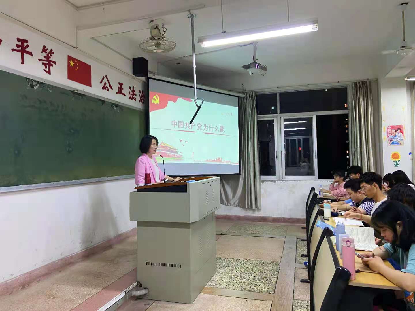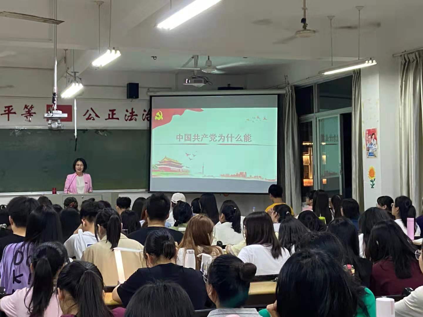 在课堂上,徐继红书记带领师生们重温党史,让大家了解到在党的领导下我们的国家和民族是如何从站起来到富起来,再到强起来。“人民群众作为社会发展的亲历者与见证者,可以见到的是在中国共产党的领导下,党的面貌,国家的面貌,人民的面貌,军队的面貌,中华民族的面貌发生了前所未有的变化。”当谈到这一句话时,徐书记讲到:中国共产党之所以能够完成近代以来各种政治力量不可能完成的艰巨任务,就在于我们党选择了并始终把马克思主义这一科学理论作为自己的行动指南,坚持在实践中不断坚持与发展马克思主义。“毛泽东思想”,“邓小平理论”,“三个代表”重要思想,“科学发展观”,“习近平新时代中国特色社会主义思想”都是与马克思主义相结合的中国产物,是推动中国共产党不断进步的新思想。正是这些具有中国特色社会主义的思想旗帜和行动指南,中华民族伟大的复兴梦才能更快更好的实现。