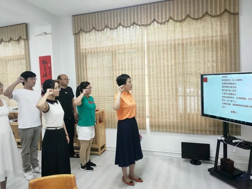 会议最后,陈越同志在双节来临之际向在座的老师致以诚挚的问候及真诚的祝福,并带领新进教师们进行宣誓,指出构建高质量教育体系、建设教育强国,必须加强师德师风建设,新时代的广大教师应当坚守初心,遵守教育法律法规,履行教书育人职责,引领学生健康成长。潘艺阳同志就师德师风建设和廉洁过节作工作强调。指出,学高为师,德高为范,教师要以德立身,以德立学,以德施教,以德化人,不断强化自身师德师风建设,严格遵守教师职业行为十项准则。
