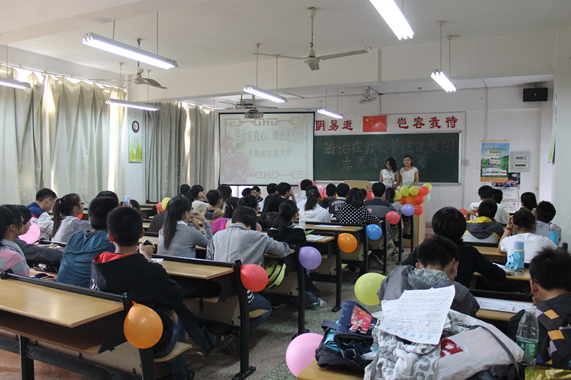 比赛中,参赛选手们围绕“法治在心中,共圆中国梦”主题自选题目,通过PPT、视频、课堂互动等多种形式,现场讲解身边的法律知识,经过选拔考核,共有六组(12名)志愿者通过选拔,担任普法进校园普法员。