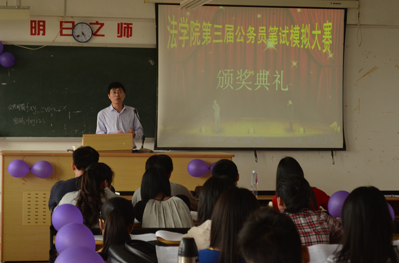 举办本届公务员笔试模拟大赛的颁奖及点评活动。此次荣获一等奖的是13法学1班林晓炜,二等奖的是13行政2班潘世攀、11行政王艺霖,三等奖的是12行政张祝林、11行政吴丹扬、12法学3班梁培娜。