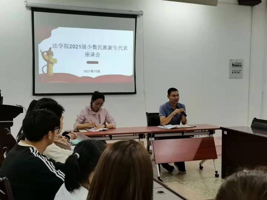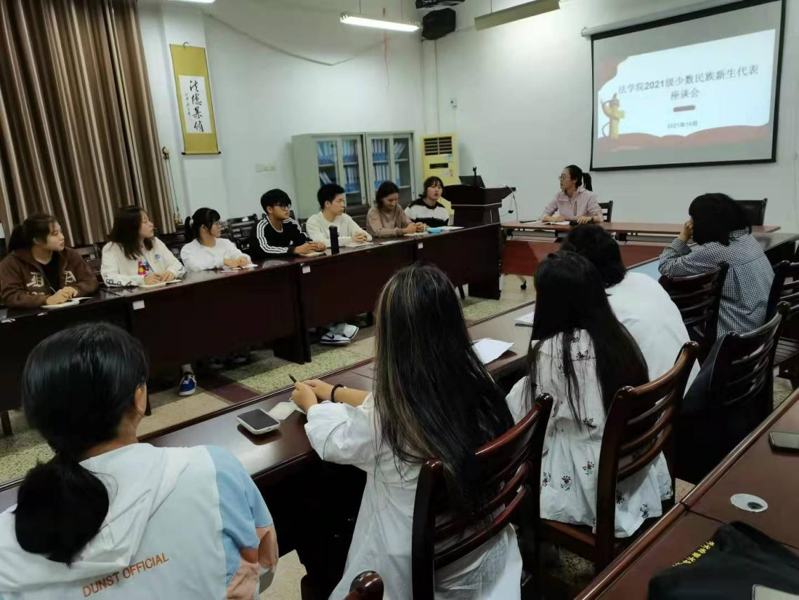 在博西106会议室召开少数民族新生代表座谈会。学院党委副书记潘艺阳,新生辅导员郑高薇以及少数民族新生代表们参加了本次座谈会。