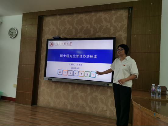 研究生发展服务课刘秀英老师、学生处管理科科长吴主敏老师为新生作《学生管理制度讲解》主题讲座,从校园管理、宿舍生活、评奖评优等多个方面的内容为新生解读了学生管理的相关制度,让新生对学校的各项管理制度有了更加充分的认识。
