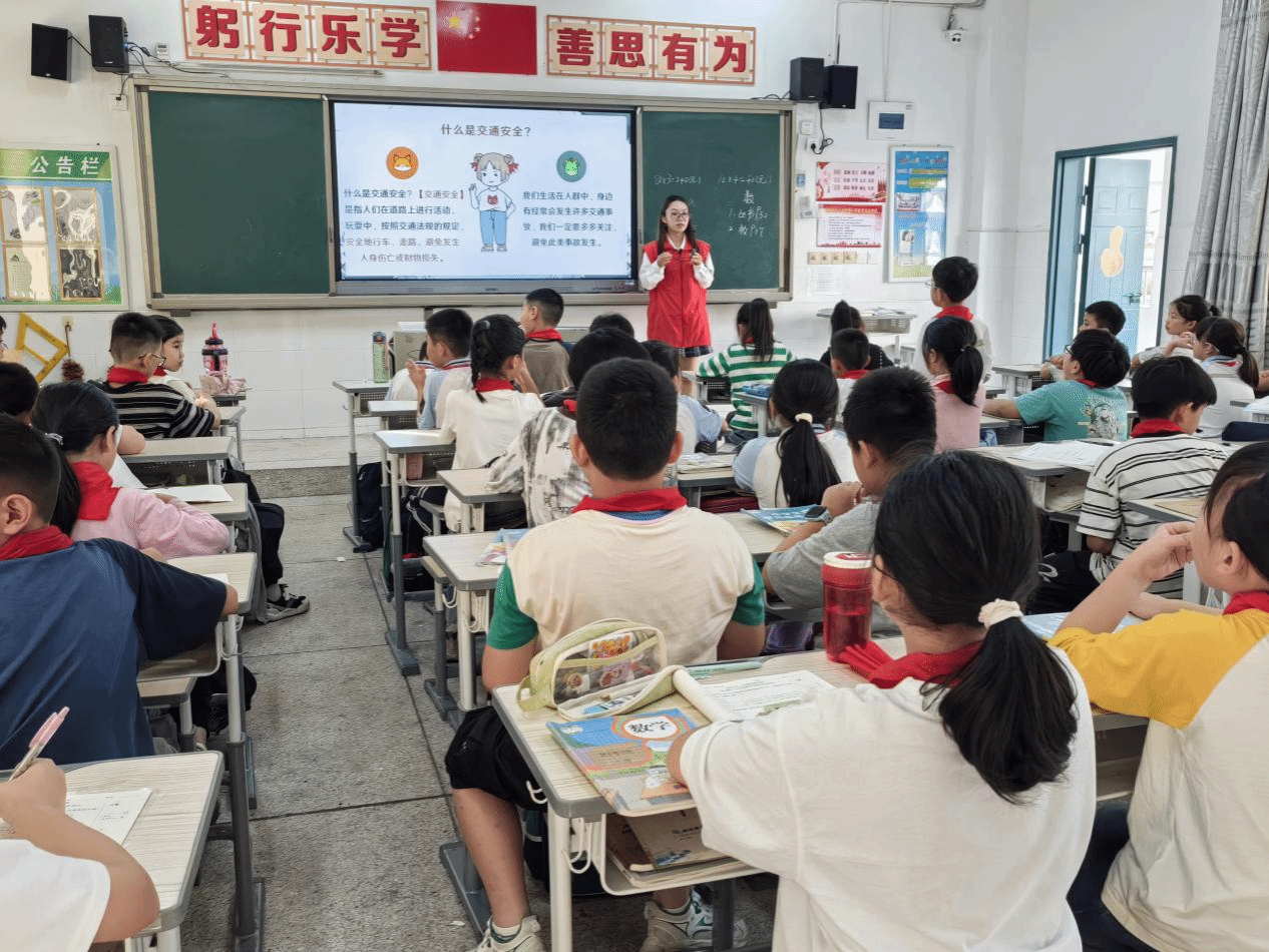课堂上,队员们从交通安全的概念入手,教会学生何为交通安全,让学生避免事故发生。紧接着介绍常见的交通信号相关法规,教会学生分辨交通信号标志。随后带动学生思考,并结合相关的法律法规对具体的案例进行分析。接着告知学生交通事故的危害以及避免交通事故的方法。最后进行有奖问答环节,让学生回答与交通安全的关的题目并给与相应的奖励。同学们热情参与,积极抢答,在寓教于乐的氛围中吸收知识,增强了安全意识和避险能力。