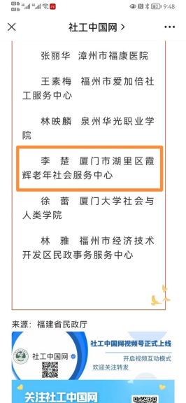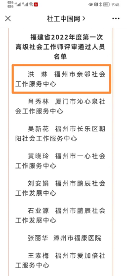 法学院2006级社会工作专业本科毕业生李楚、洪琳两名学生通过自己的努力,顺利通过了高级社会工作师测试。李楚现担任厦门市湖里区霞辉老年社会服务中心的执行主任一职,洪琳现担任福州市亲临社会工作服务中心的主任一职。