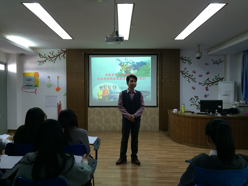 12月18日下午,福州大学副教授士吴旭平应邀为法管学院师生做了题为《活跃老化与照顾服务》的精彩讲座,社会工作专业、劳动与社会保障专业的部分教师和学生到场聆听。