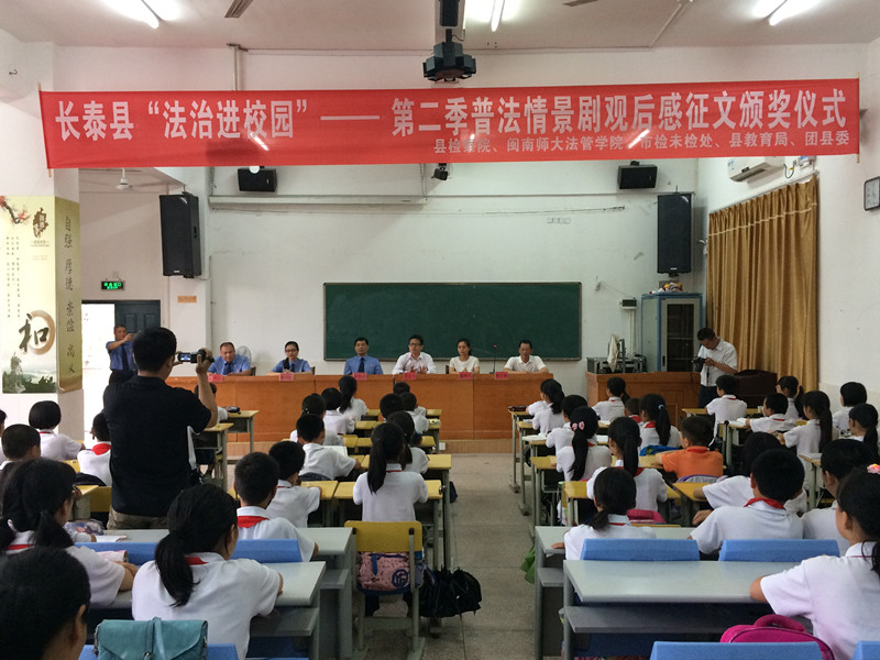 2017年6月14日下午,法学与公共管理学院院长何东平一行赴长泰县第二实验小学参加普法情景剧观后感征文比赛颁奖仪式。长泰县检察院检察长李鲁漳、长泰县教育局、团县委、漳州市检察院未检处等领导一同参加颁奖仪式。颁奖仪式由长泰县检察院副检察长王阿忠主持。