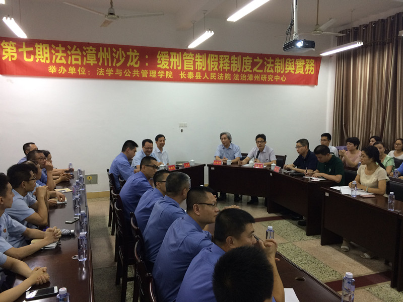 博文楼举行,主题为“缓刑管制假释制度之法制与实务”。这次研讨会由法学与公共管理学院、长泰县人民法院、法治漳州研究中心共同举办,沙龙邀请了中华司法研究会常务理事、台湾中央警察大学法律系主任余振华教授做主题报告,漳州市中院副院长王文平、长泰县法院院长姚毅奇、漳州市中院涉台庭庭长林立、漳州市检察院监所检察处副处长陈伟凯、福州大学博士何群等出席了论坛并依次作解读发言。沙龙由法学与公共管理学院院长、法治漳州研究中心主任何东平教授主持。