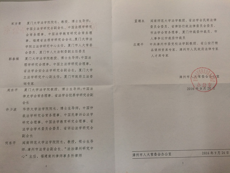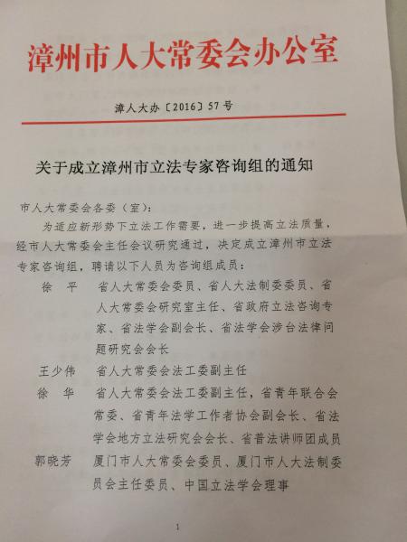 近期,漳州市人民代表大会常务委员办公室下文,聘请法学与公共管理学院何东平、蓝潮永两位教授为漳州市立法专家咨询组成员。