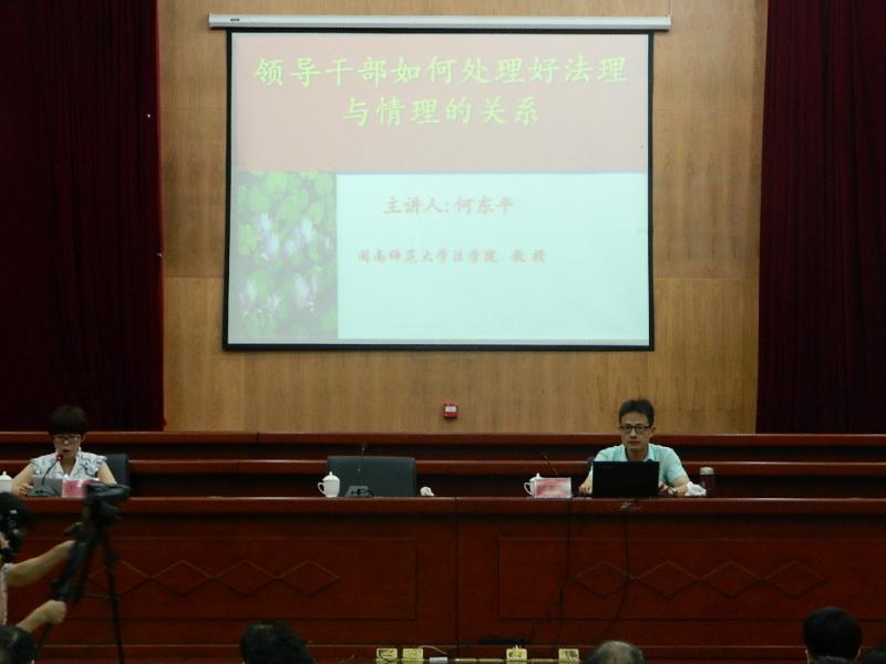 2016年9月30日华安县“百名法学家百场报告会”如期召开,法学与公共管理学院院长、法治漳州研究中心主任何东平教授应邀为华安县委理论学习中心组扩大会做题为《领导干部如何处理好法理与情理的关系》的专题讲座。