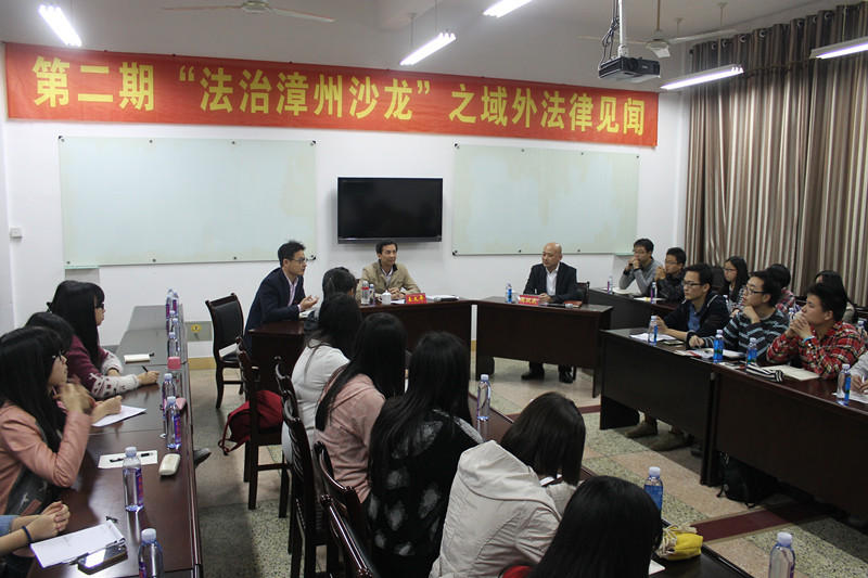 2015年3月29日晚,由法学与公共管理学院、法治漳州研究中心举办的第二期“法治漳州沙龙”之《域外法律见闻》在博文楼西区106室如期举行。本次沙龙邀请了漳州市中级人民法院副院长王文平、龙海市人民检察院检察长周跃武担任报告人,法学与公共管理学院院长何东平教授主持了沙龙。