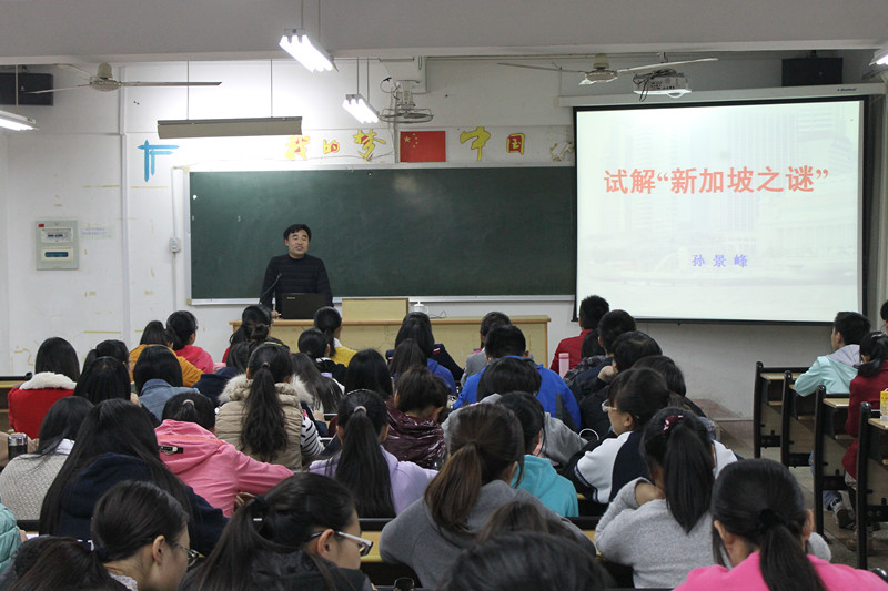 师生主讲《解密新加坡的政党之谜》的讲座。讲座中,孙教授以史实材料为基础介绍了新加坡国家与人民行动党的渊原,分析了行动党之于新加坡政治中的地位,并重点对新加坡政党政治的选举制度、特点及廉政制度进行了全方位阐述。讲座中,孙教授由浅入深,旁征博引,案例翔实,语言幽默,赢得了听众们的阵阵掌声。