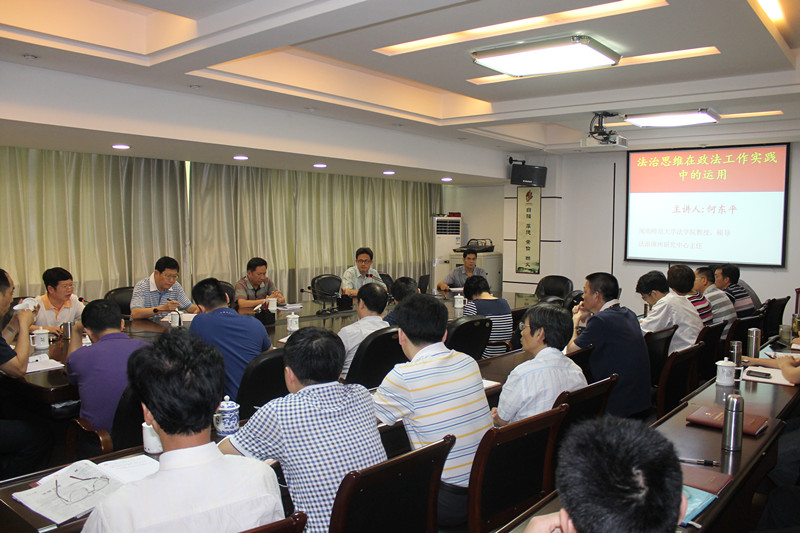 何东平教授为大家作《法治思维在政法工作实践中的运用》专题讲座,重点介绍了培育法治思维的重要性、法治思维的基本内容,并就在政法工作实践如何运用法治思维,从理论层面和实践层面做了较为系统的阐述。何东平教授所讲的内容逻辑严密、案例翔实,获得阵阵掌声,得到了领导的充分肯定和较高评价。