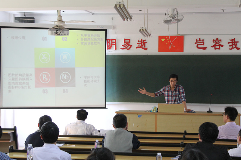 田钦老师从PPT制作的基本操作、颜色的搭配、文字的多少、图片图表图标的选择技巧等方面一一进行了讲解和说明,并分享了自己的使用心得,田老师指出“不贴切、质量差的图片比没有图片更糟糕”,“PPT制作的焦点,不是PPT本身而是所呈现的内容。” 此培训活动受到了全院教师的欢迎和肯定,对加强教风建设,提升教师教学技能和综合素质起到了积极的作用。