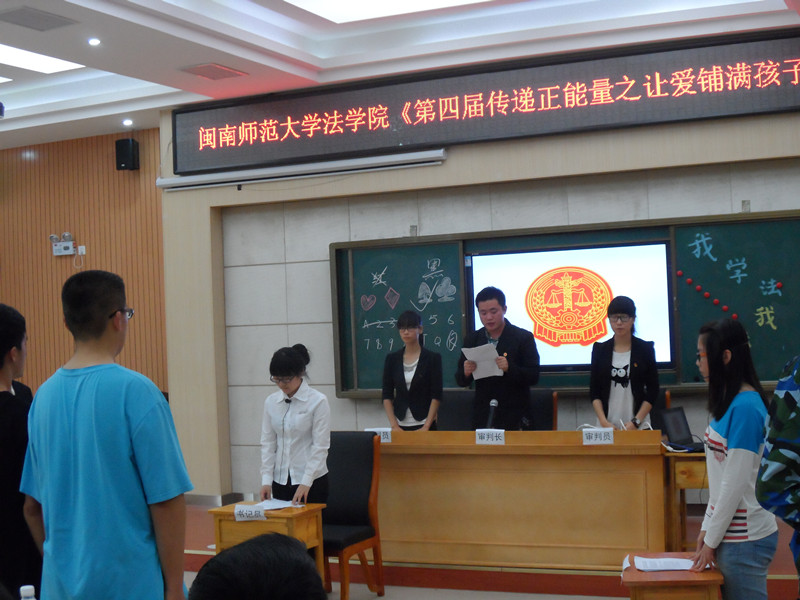 青年志愿者们先后表演了«扶不扶»、«“孝”逐颜开»、«良心»等有关法律、思想教育的小品,生动地展现生活中常见的法律误区,引导学生树立正确的法律观。第二场则把模拟法庭带进闽师大附小,向孩子们传递“法在身边,与法同行”的理念。以逼真的场景,真实再现了法庭审判过程,以案释法,以身说法,让未成年人从中受到教育和启迪。活动现场气氛热烈,赢得了孩子们的阵阵掌声。活动的最后,主持人带领孩子们齐声朗诵《弟子规》,孩子们个个积极配合,齐声朗诵。表演结束后,孩子们都表示深受触动,踊跃发言,高呼志愿成为传递正能量的楷模。