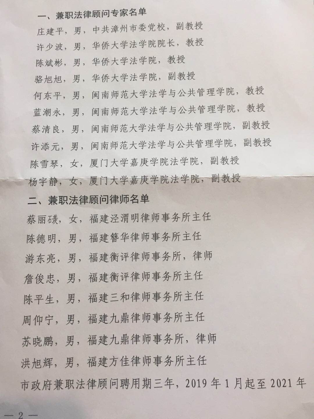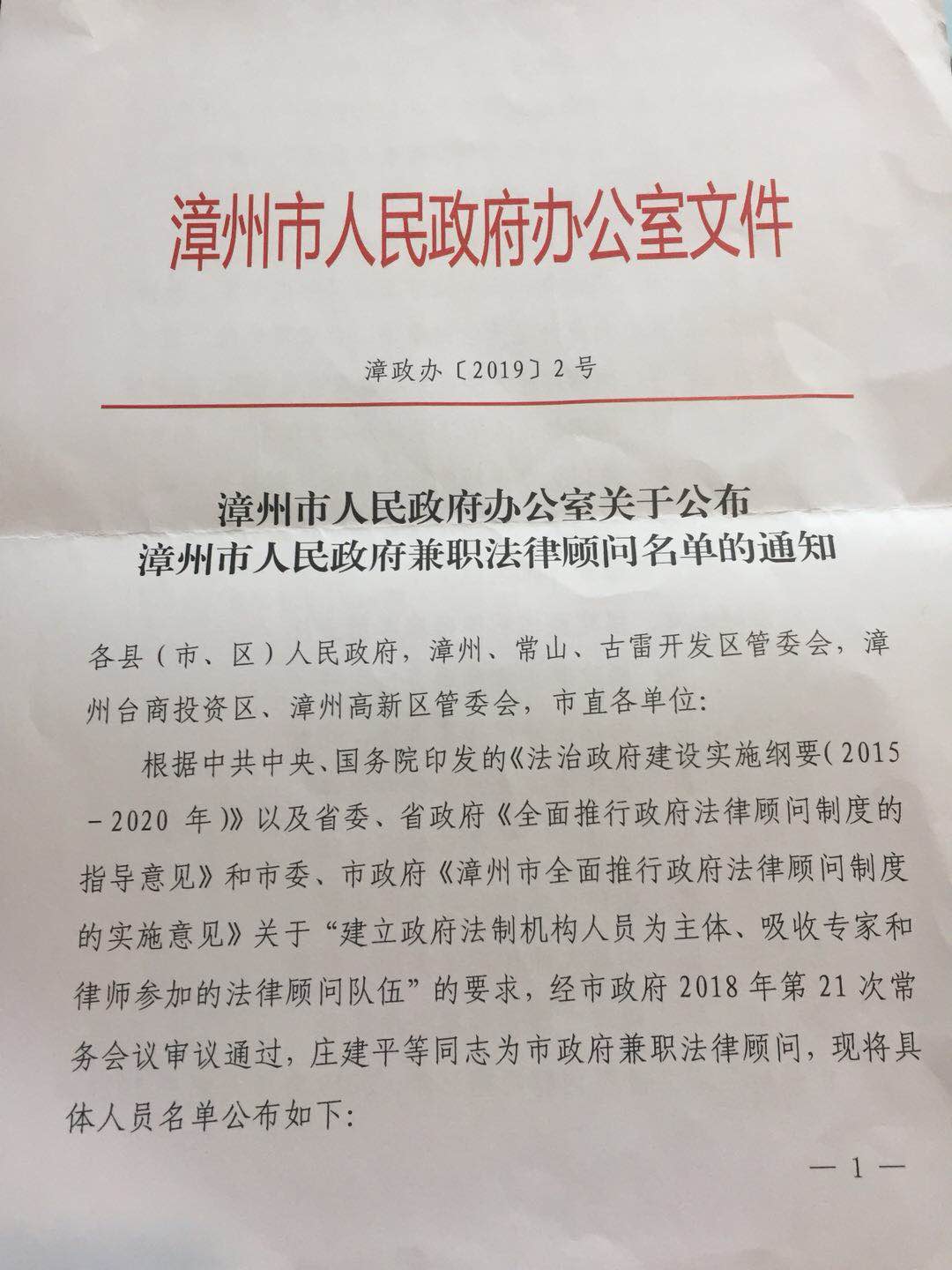 四位老师入选漳州市人民政府兼职法律顾问,加强了对地方法治发展的服务深度,为漳州市人民政府有重点地就事关漳州法治建设的地方性法规、条例与重大决策,加强地方性法规立法前的咨询工作等提供优质的法律服务,为漳州法治建设的推进尽绵薄之力。
