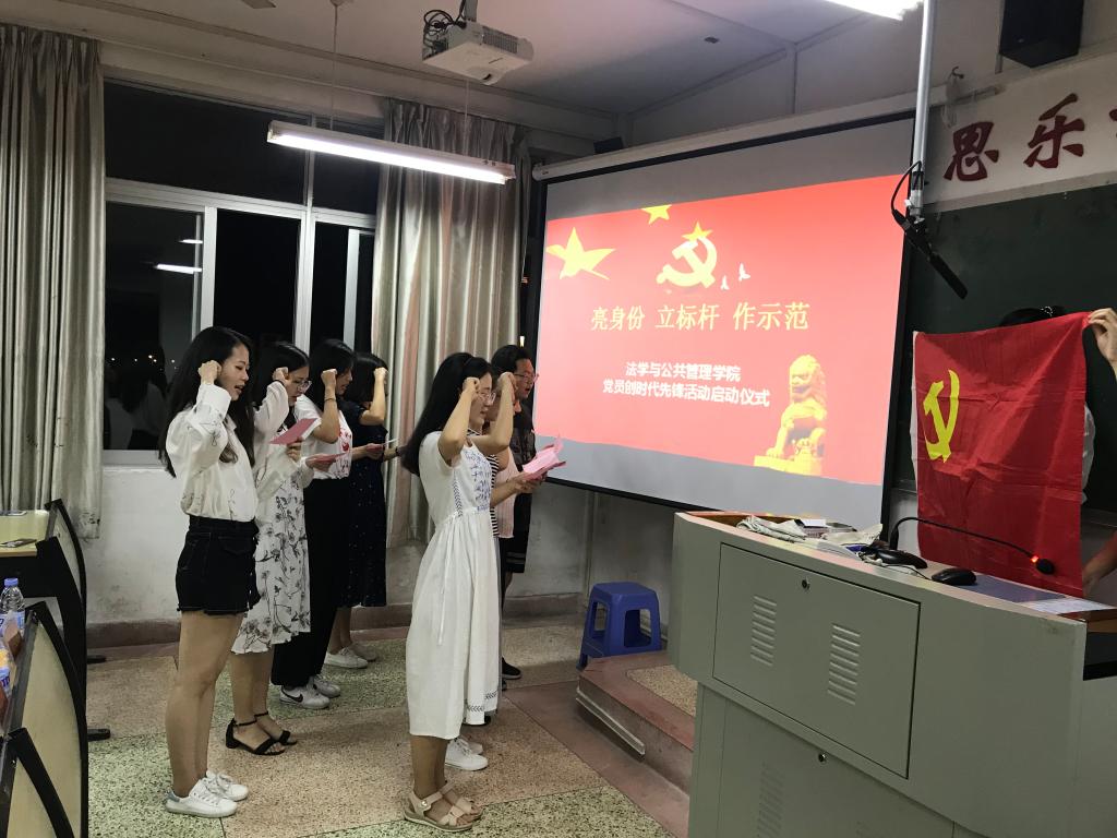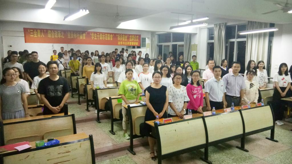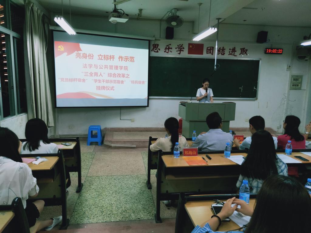 举行“亮身份、立标杆、作示范”法学与公共管理党员“创时代先锋”启动仪式暨“三全育人”综合改革之标杆示范宿舍挂牌仪式。院党委领导、党委组织员、全体政工干部以及学生党员代表、主要学生干部参加了活动。