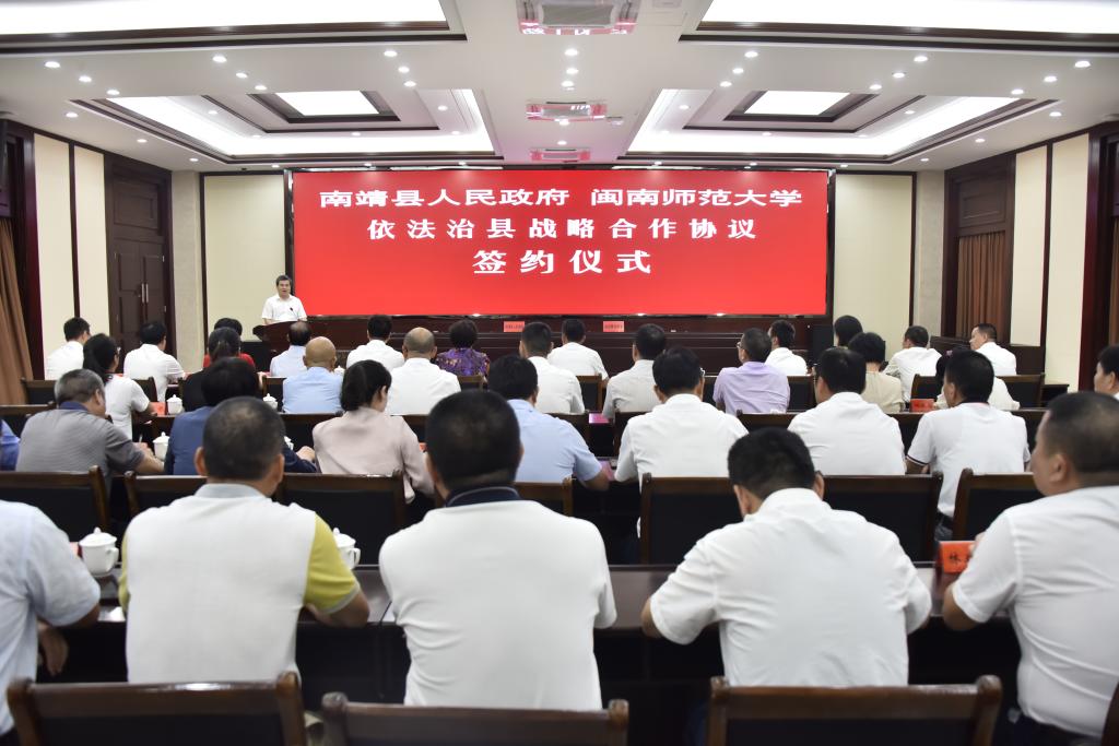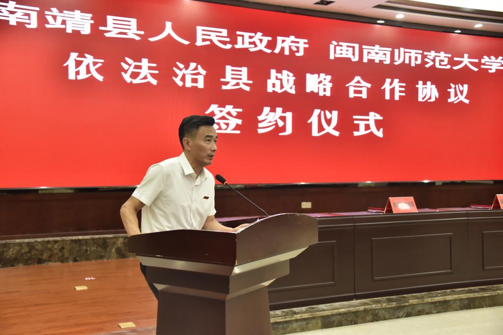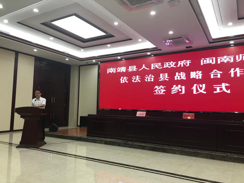 党委书记吴彬镪、副校长蒋一婷、法管学院党政班子、双方相关职能部门负责人等参加了签订仪式。签订仪式由南靖县委常委、副县长何东平主持。黄劲武、吴彬镪分别代表双方致辞,蒋一婷与钟科共同签署战略合作协议。