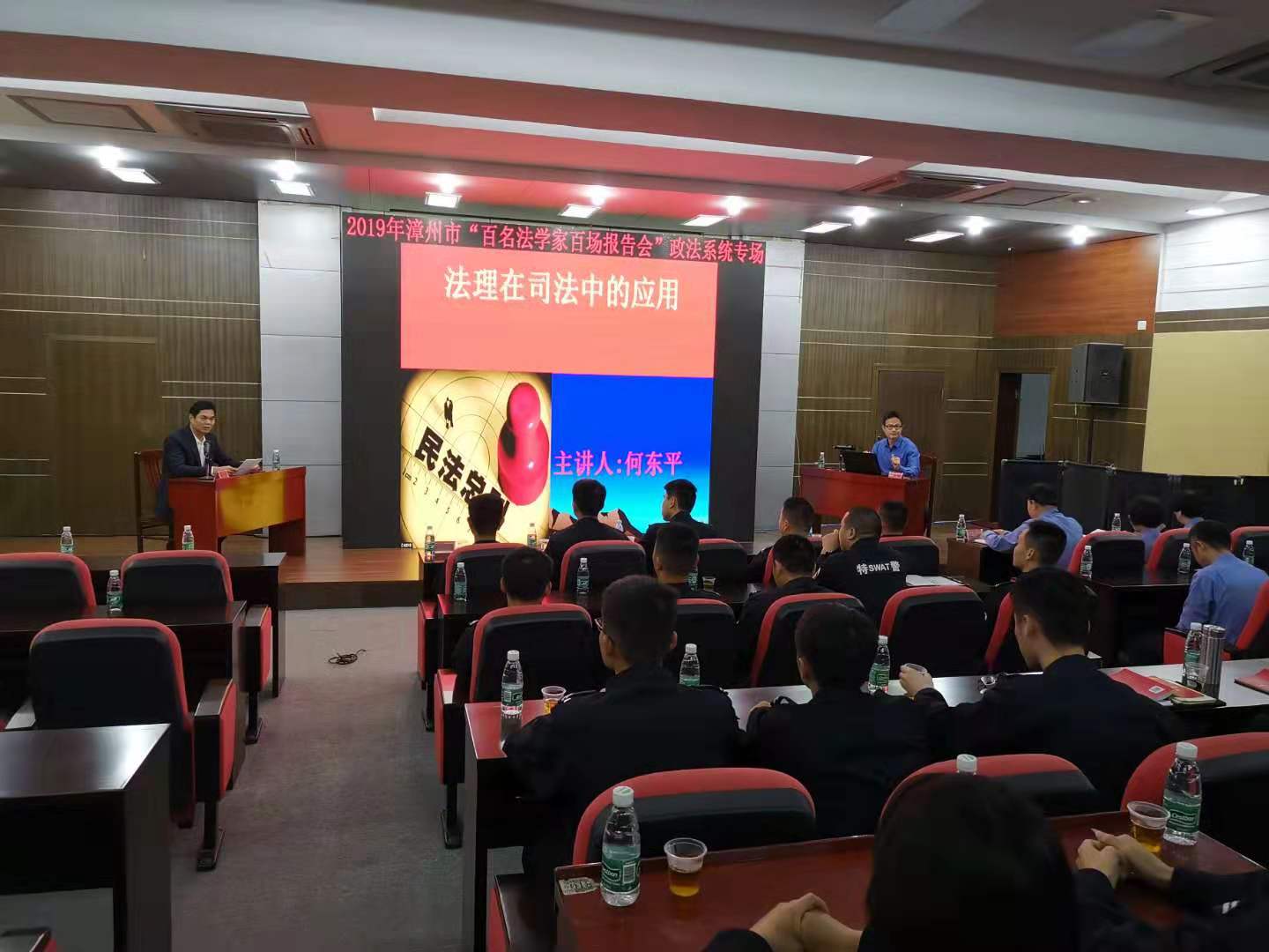 何东平院长受邀作题为《法理在司法中的运用》的主题讲座,报告会由市法学会会长陈青树主持。