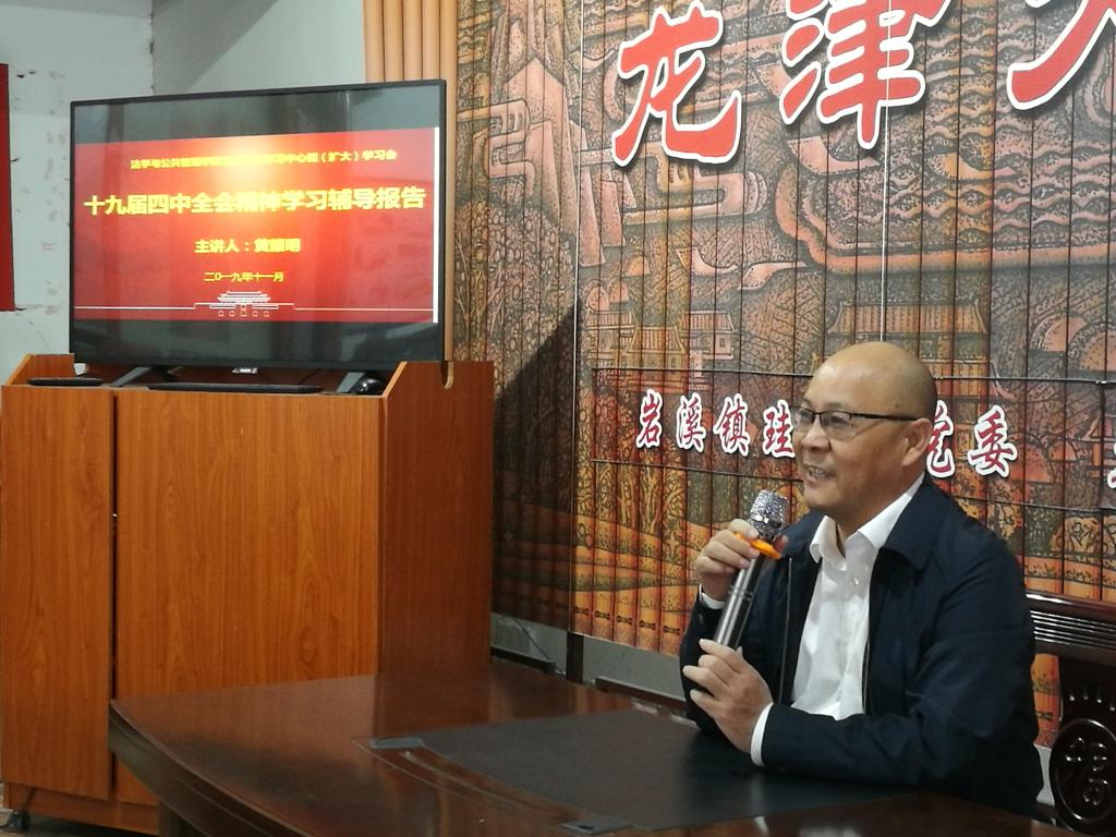 活动中,学院党委专门安排黄耀明副院长作了十九届四中全会精神学习辅导报告。黄副院长指出,我们法管学院要抓紧时机,不忘初心,牢记使命,加强国家治理能力和治理体系理论研究,为国家培养更多更优秀的法治人才、社会工作人才、国家治理与社会治理人才。