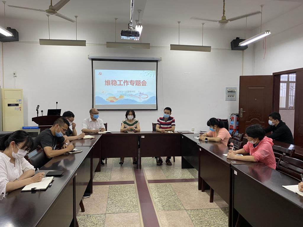 在博文楼西区106召开维稳工作专题布置会议。学院党委书记徐继红、学院副院长黄耀明、学院党委副书记潘艺阳和全体行政人员及辅导员参加了会议。