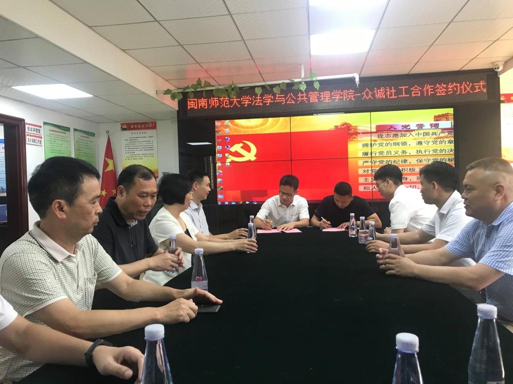 法学与公共管理学院“就业实习实践基地”、“青年就业创业见习基地”等牌子揭牌。揭牌仪式结束后,我院与龙海市众诚社会工作服务中心共同签订了校企战略合作协议。