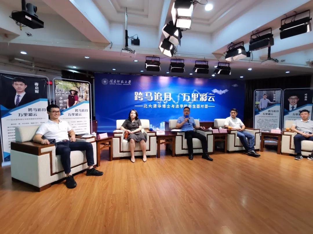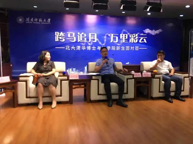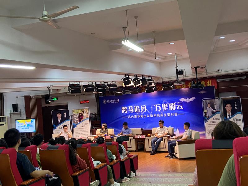 新生面对面”沙龙,沙龙由院长何东平主持。沙龙邀请了来自北大的李昭君、蒋启财和来自清华的窦秉政、叶泳达四位博士担任嘉宾,分为嘉宾学习成长经历分享和互动两个环节,来自全校的众多师生参与,现场互动频繁,掌声阵阵,气氛十分热烈。