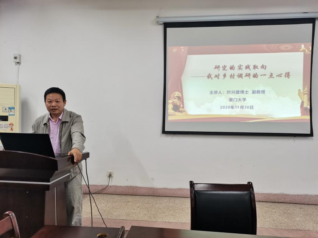 在“研究的实践取向—我对乡村调研的一些心得”讲座中,叶兴建博士详细介绍调研实践的过程,分享了在乡村调研中收获的一些心得。重点介绍了以实践为取向的研究过程,在2010年到福建省宁德市调查研究“农户自立服务社”小额信贷项目;2014年到湖北恩施市调研龙凤镇扶贫试点项目;目前,调研“闽宁模式”项目。最后,他认为,只有不断进行调查,才能从实践中提炼可供借鉴的经验与模式。
