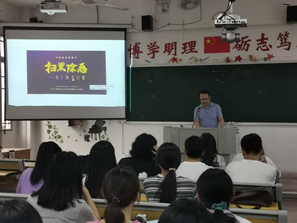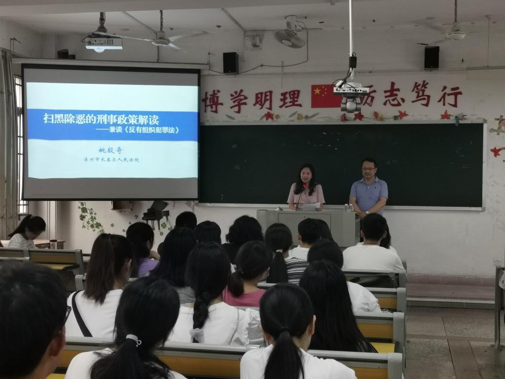 讲座中,姚院长分别解读了刑事政策、黑社会性质组织犯罪、扫黑除恶的刑事政策文件、《反有组织犯罪法》草案、扫黑除恶的典型案例,从在一线工作的经验分享了扫黑除恶的重大进展。本次讲座理论与案例相结合,阐述了扫黑除恶的重要意义。 在提问讨论环节,同学们踊跃发言,姚院长对同学们的提问逐一进行解答,在座同学受益匪浅。