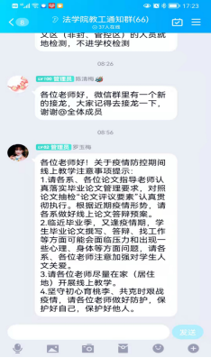 在教学上,由学院教务科牵头制定线上教学工作方案等有关线上教学的相关注意事项,开展线上教学督导,及时发布教学相关注意事项,做到防控工作和业务工作两不误,保证线上教学的质量。