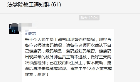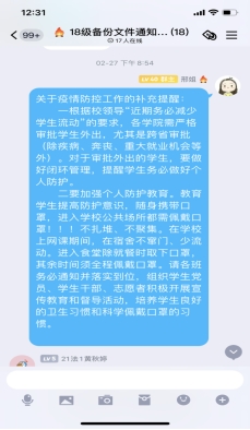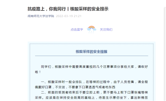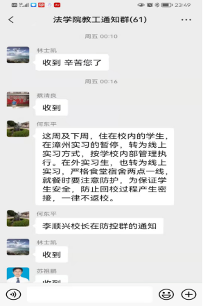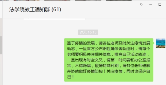 及时调整疫情防控领导小组和疫情防控工作预案。及时向学院教师以及学生通知、落实和排查学校、学院发布的各种防控政策。特别地,学院要求教师要每天在小程序打卡健康码,保证防控相关数据信息的及时性和准确性。通过开全院视频大会、学生班会、张贴宣传海报等,做好疫情防控的宣传工作。