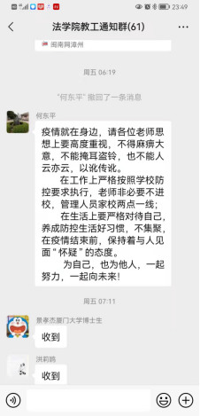 学院党政领导班子要求学院全体师生务必要不折不扣地服从和执行学校及学院的各种防控要求,思想上要高度重视,提高思想站位,要看清形势,严格管理,扛好责任;要保持高度的警惕,做到行动自觉;要做好自律工作,用心对待疫情防控工作,提升应急处置能力;要坚守防控服务的第一线,强化引导,提高师生的防护意识,维护师生生命安全与身体健康。