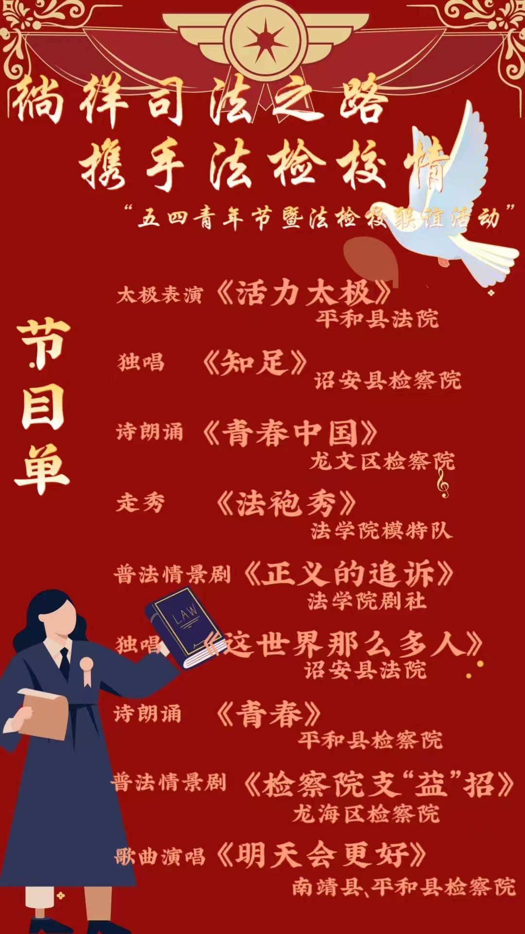 第七个节目由平和县检察院带来诗朗诵《青春》。青春是激情燃烧的火炬,激励我们要博学多思开拓进取;青春是漫天飞舞的白雪,警示我们要灵动自信优雅纯洁。
