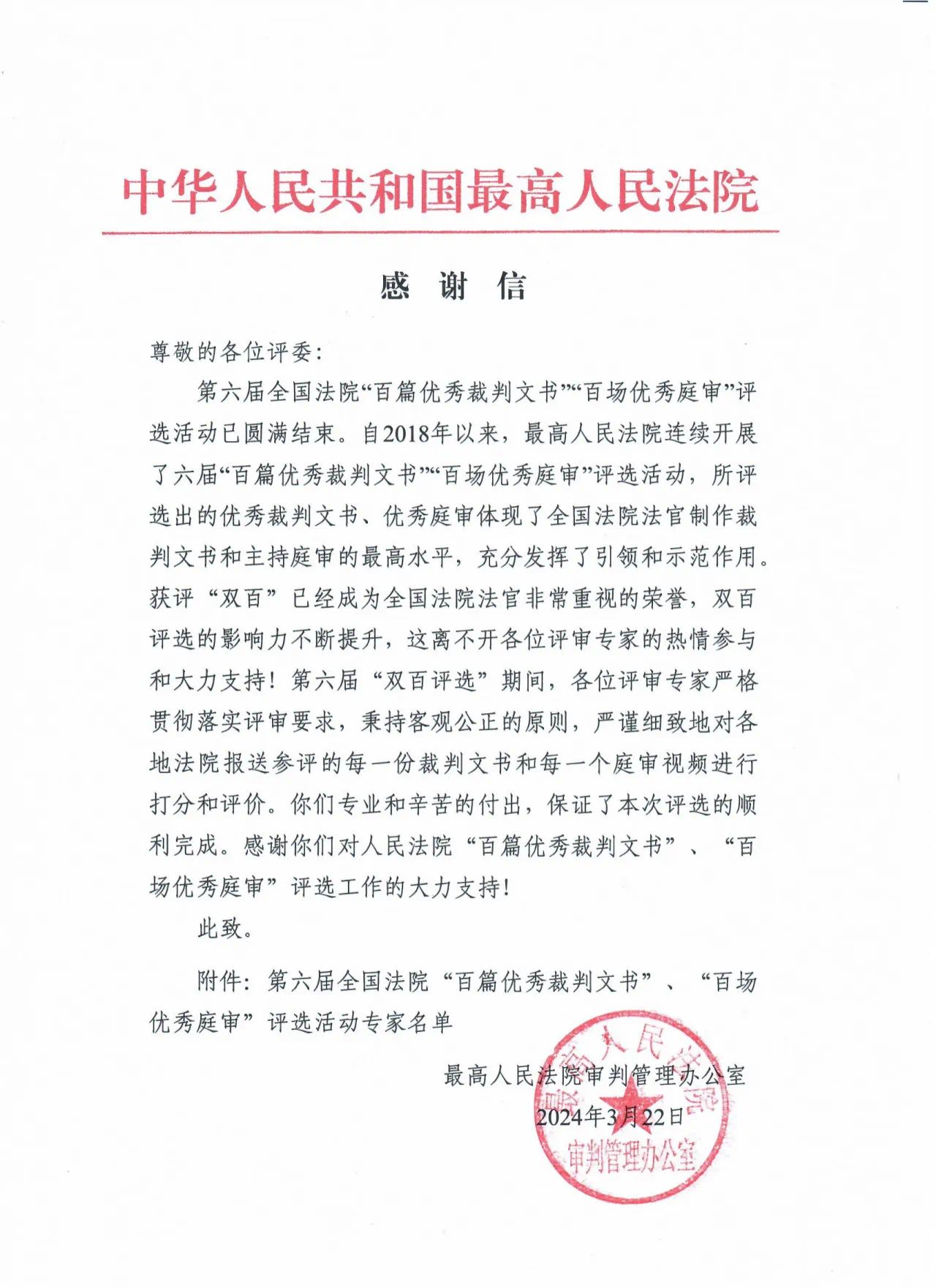 近日,最高人民法院审判管理办公室向第六届全国法院“百篇优秀裁判文书”“百场优秀庭审”评选活动评委致感谢信,对评审专家客观公正、严谨细致的工作表示感谢。风车动漫p
