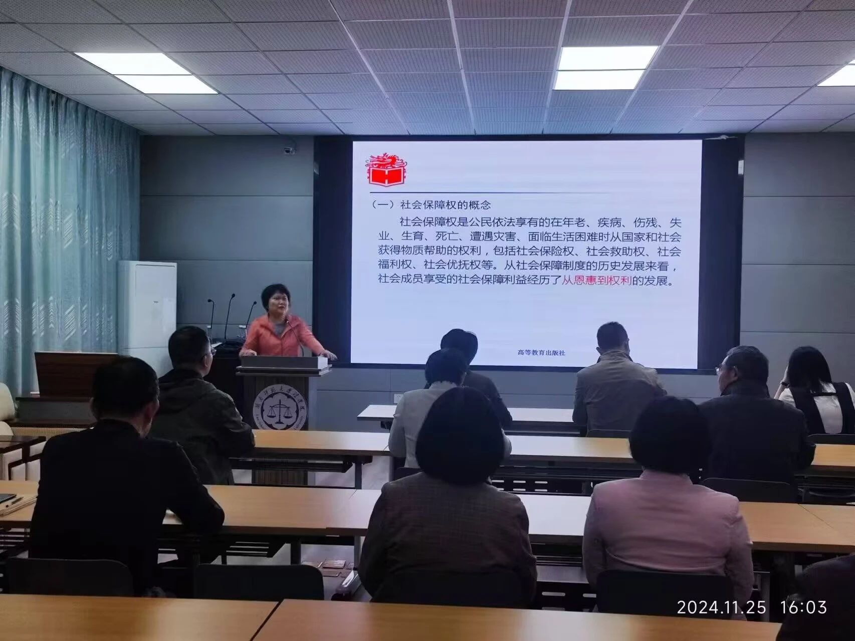 法律系林慧老师从党的二十届三中全会报告中的法治是中国式现代化的重要保障论断入手,结合《劳动与社会保障法》“社会保障权的概念”融入课程思政,认为必须全面贯彻宪法,维护宪法权威,健全法律面前人人平等保障机制,弘扬社会主义法治精神,全面推进各方面工作法治化。