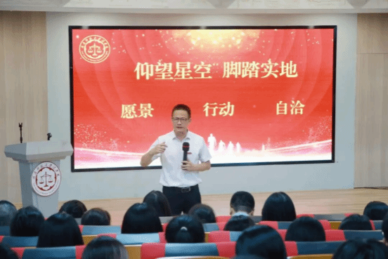 院长何东平以“仰望星空,脚踏实地”为主题为新生们带来开学第一课。他以“愿景”“行动”“自洽”三个关键词为线索,为新生们勾勒法学求学之路的方向。他寄语新生,既要心怀法治愿景仰望星空,也要以扎实行动走好每一步,在自洽中成长为有理想、有本领、有担当的时代新人。