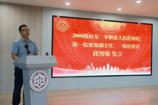 校友代表、平和县人民检察院第一检察部副主任、一级检察官邱智雄结合自己大学感受、工作经历和对未来展望等方面,向新生们分享经验。他寄语新生,要保持朝气,接受磨炼,勇于绽放,在胸怀家国中坚定理想信念,在勤学善思中进取实践,为法治中国建设贡献青春力量。