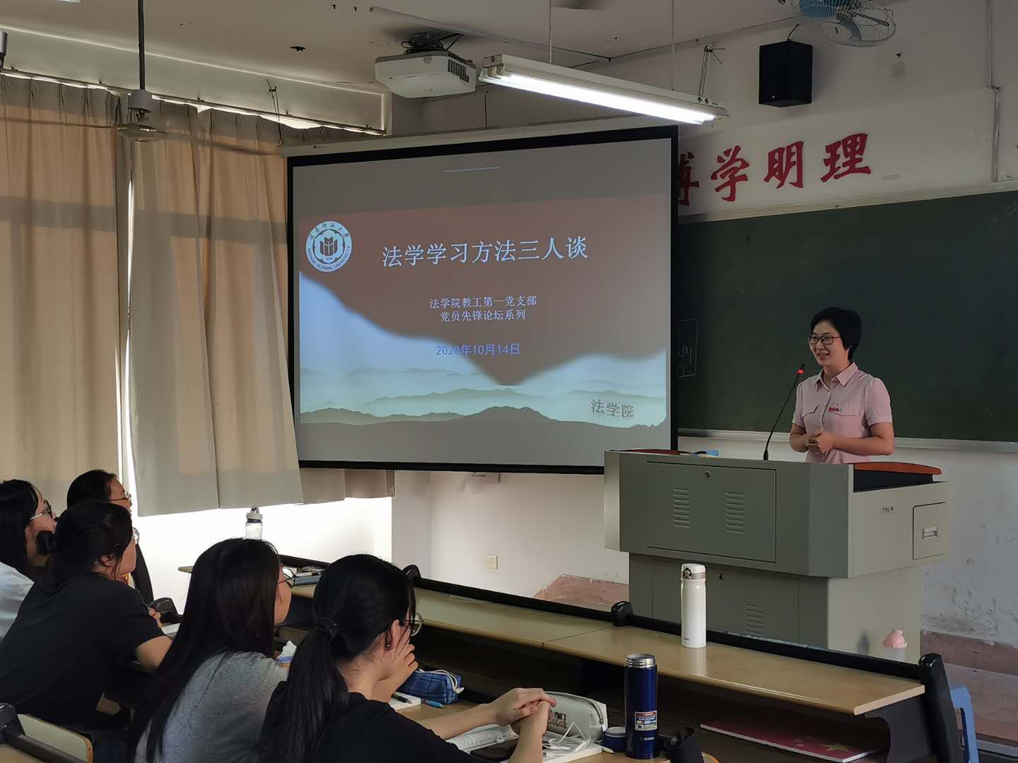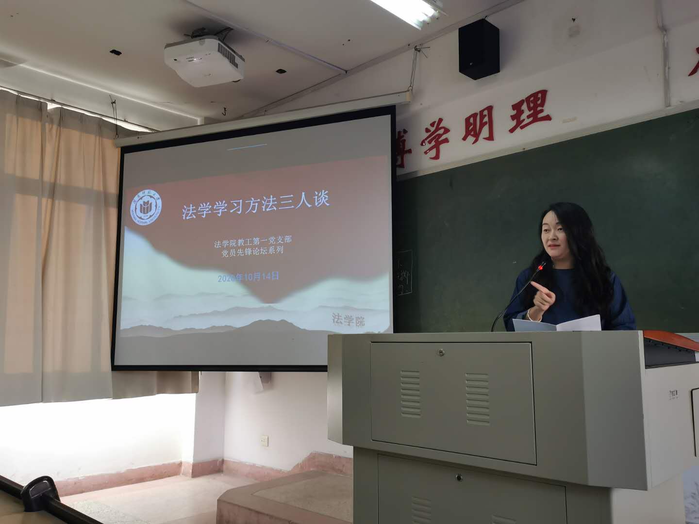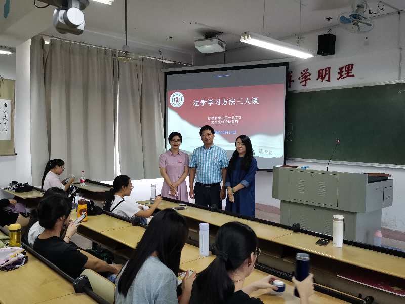 教工第一党支部党员教师纷纷开展“党员先锋论坛”系列活动。10月14日下午,李莉、韩巧香、王贺洋三位党员老师以“法学学习方法三人谈”为主题,结合各位老师自己的学习成长经历,向学生介绍法学学习方法。李莉老师指出当下学生学习最缺乏的是“专注”,希望学生针对自身特点摸索出适合自己的学习方法,提高学习效率。韩巧香老师强调大学生应当尽早做好大学学习规划以及未来工作规划,制定好人生目标,努力奋斗。王贺洋老师建议学生多读“无用”的书,改变应试思维和学习习惯,学会独立思考,全面提高自身综合素质和人文素养。三位老师主题发言后,还与学生进行了问答互动。李成福老师、肖世贵老师分别以“监察法与刑事诉讼法衔接若干问题”、“扫黑除恶法治宣传”为主题举办了讲座。蓝潮永教授举办“变革中土地征收法律制度”讲座。