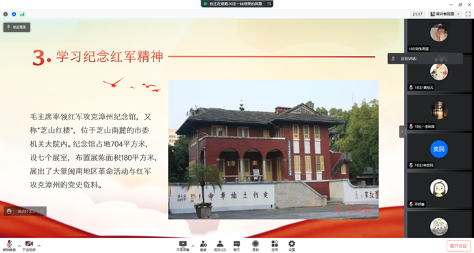 学生党员王晓娟认为:光辉历史,丰碑永存。漳州是一片充满红色记忆、有着光荣革命传统的红土地,曾经多次发生过对中国革命进程产生重大影响的事件,在党的百年光辉历程中留下了不可磨灭的漳州印记。1932年4月,毛主席正确分析苏区形势,力排“左”倾方针,提出“出击外线、直下漳州”的意见,在苏区中央局书记周恩来同志的积极支持下,率领中国工农红军东路军攻克漳州,在中国革命史上写下了熠熠生辉的一页,也留下了一笔弥足珍贵的精神财富。抚今追昔,饮水思源;回望历史,坚定前行。新时期,我们要牢记革命历史、赓续红色血脉,弘扬革命精神、砥砺奋进之志,为祖国发展贡献自我力量。